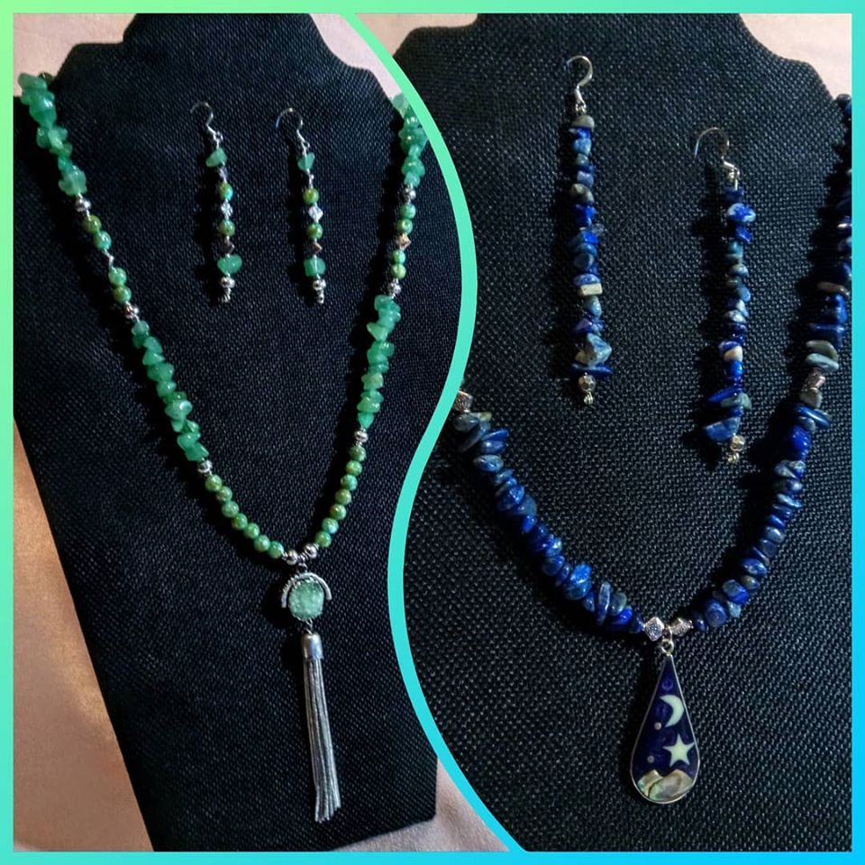 Aventurine/River Shell and Blue Jasper Pendant Sets Published May 28, 2020 at 960 × 960 Aventurine Sold! ~ Blue Jasper, shell pendant – Sold! Aventurine, river shell, fluorite pendant w/earrings and blue jasper with abalone starscape pendant w/earrings